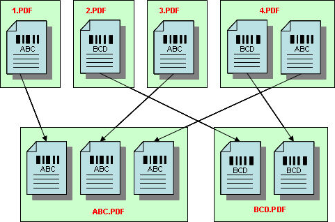This profile expects each page to possess a barcode. It assembles the output document from those input pages whose barcodes have the same value. The input pages can come from one or more input files: